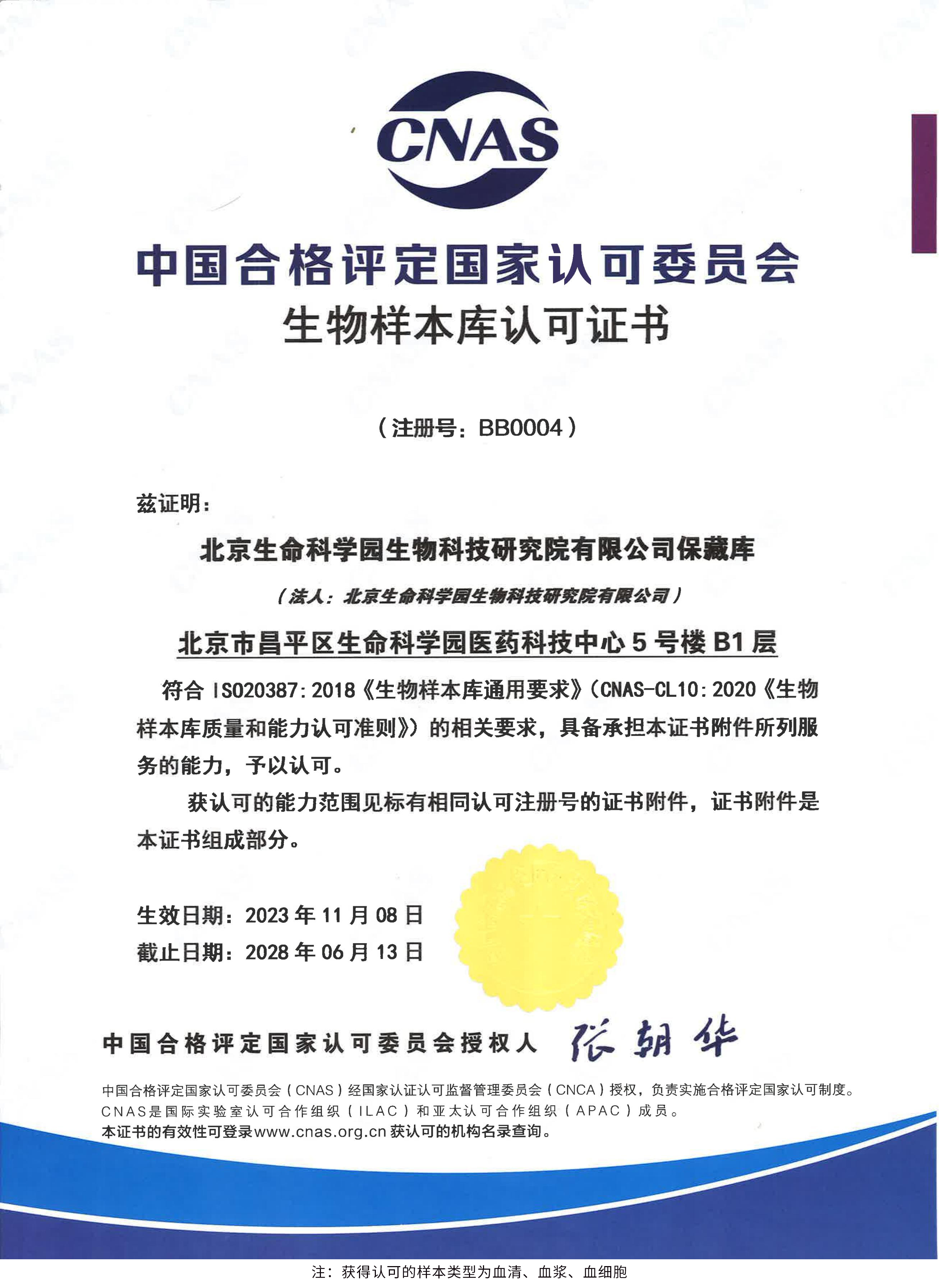 北京生命科學(xué)園生物科技研究院(以下簡稱“北京生物樣本資源庫”)(Biobank of Life Science Park,簡寫“BoLSP”)是一家由北京市科委和中關(guān)村生命科學(xué)園共同支持設(shè)立的第三方生物樣本庫公共服務(wù)平臺,秉承北京重大疾病臨床數(shù)據(jù)和樣本資源庫(以下簡稱“北京庫”)(Beijing Biobank of Clinical Resources,BBCR)十余年的發(fā)展成果,聚合眾多臨床樣本專家的專業(yè)共識,致力于在生命科學(xué)、生物醫(yī)藥研究領(lǐng)域發(fā)揮銜接樣本資源持有者與研究者的橋梁作用,解決生物樣本資源開發(fā)上下游信息不對稱、資源共享困難等問題。研究院在北京中關(guān)村生命科學(xué)園昌平園區(qū)建立了2000㎡生物樣本庫,最大存儲規(guī)模達(dá)1000萬份。研究院遵循CNAS-CL10:2020《生物樣本庫質(zhì)量和能力認(rèn)可準(zhǔn)則》,同時結(jié)合北京庫過去十年的工作經(jīng)驗與教訓(xùn),建立了一套完善的生物樣本保藏質(zhì)量管理體系,從人、機(jī)、料、法、環(huán)、控多個角度,實現(xiàn)生物樣本保藏過程的全面質(zhì)量控制,先后獲得國家科技部頒發(fā)的人類遺傳資源保藏行政許可證書和中國合格評定國家認(rèn)可委員會(China National Accreditation Service for Conformity Assessment,CNAS)頒發(fā)的“CNAS認(rèn)可證書”。
